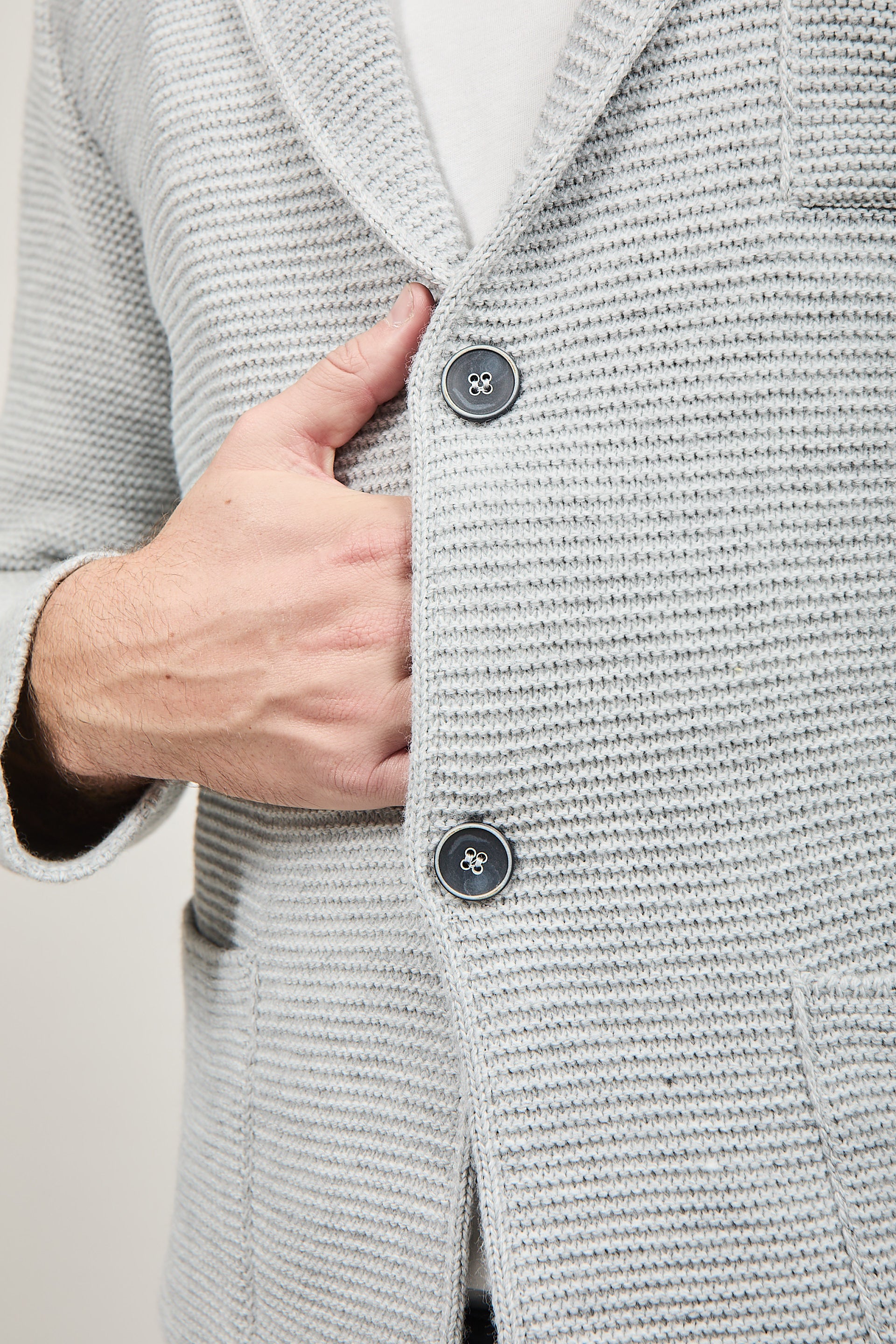 Dettagli: chiusura con due bottoni • due tasche • tasca lato cuore con pochette