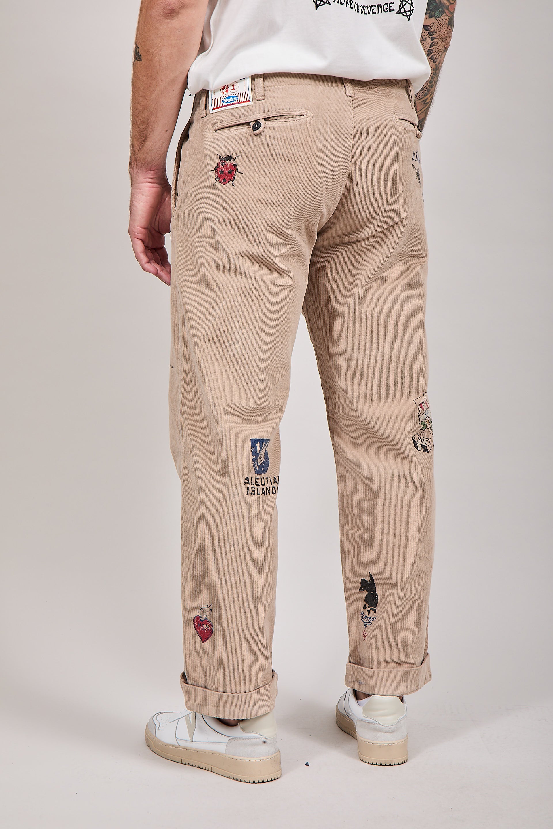 Dettagli: chiusura con bottoni • due tasche laterali e due posteriori con chiusura con bottone • passanti per la cintura in vita • varie stampe colorate presenti fronte e retro
